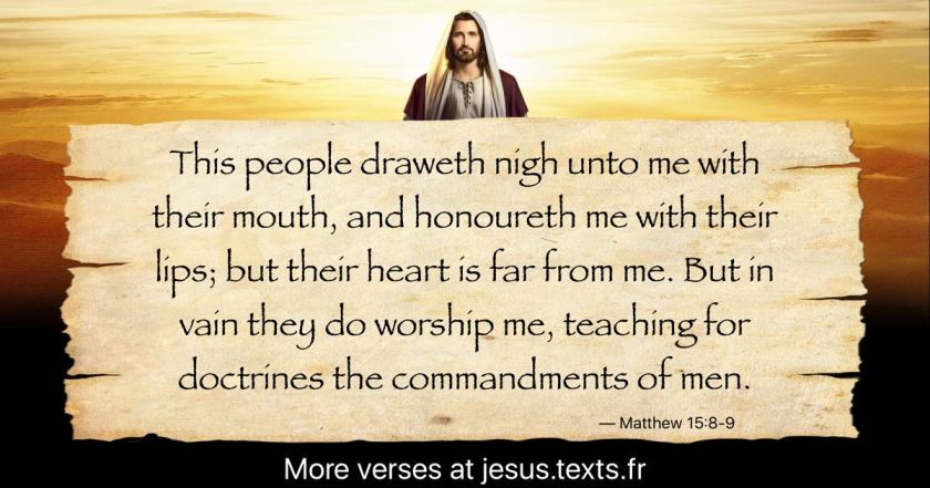 “These people honor Me with their lips, but their hearts are far from Me. 9 They worship Me in vain; they teach as doctrine the precepts of men.” 10Jesus called the crowd to Him and said, “Listen and understand.” Matthew 15:8-9